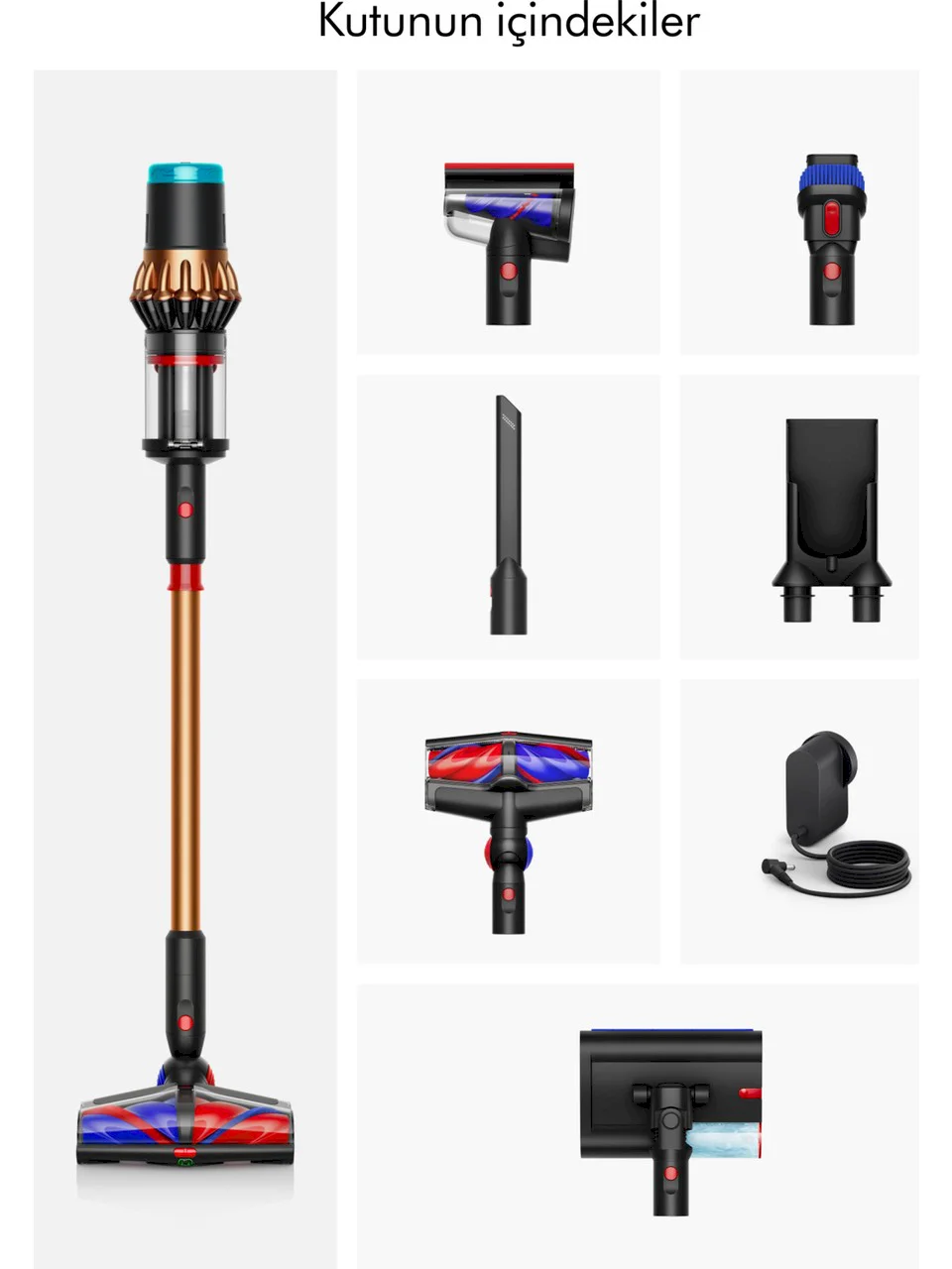 Dyson V16 Piston Animal Submarine™ ıslak kuru kablosuz süpürge (Mat siyah/Bakır)Dyson V16 Piston Animal Submarine™ ıslak kuru kablosuz süpürgemizin kutu içeriğinde; Tüm zeminleri algılayan konik temizleme başlığı, Submarine™ 2.0 ıslak temizleme başlığı, Anti-tangle Mini Motorhead 2.0, Kombinasyon başlığı, Aralık temizleme başlığı, Duvar askı ünitesi ve şarj aleti bulunmaktadır. Dyson'ın en güçlü, en yeni ve en akıllı kablosuz süpürgesi 1Boru veta başlığı, eğilmeden kolayca takıp çıkarın.Entegre aralık temizleme başlığına anında erişim sağlayın veya yüksek ve alçak yerlerin çok yönlü temizliği için el süpürgesine dönüştürün.Yeni Dyson Hyperdymium™ 900w motor315 AW emiş gücü 270 dakikaya kadar çalışmaYeni Tüm zeminleri algılayan konik temizleme başlığıUzun saç ve tüylerin dolanmasını önler 4Tüm zemin tipleri için otomatik olarak ayarlanabilen temizleme başlığı 5Görünmeyen tozları açığa çıkarırAyrı ıslak temizleme başlığıSert zeminlere dökülmüş sıvıları temizlerİnatçı lekeler için özel nemlendirme moduYeni sıkıştırmalı hazne30 gün boyunca tozu muhafaza edebilecek şekilde sıkıştırır6Boşaltılırken ardında toz bırakmaz1 Emiş gücü, IEC 62885-4:2023 (Sürüm 1.1) Bölüm 5.11 uyarınca, giriş noktasında, Boost modda test edilmiştir. Anti-tangle teknolojisi performansı, ana temizleme başlığıyla Boost modda 60 cm uzunluğundaki saçta test edilmiştir. 300 AW'den fazla emiş gücü özelliğine sahip kablosuz süpürgelere kıyasla.2 Emiş gücü, IEC 62885-4:2023 (Sürüm 1.1) Bölüm 5.11 uyarınca, Boost modda giriş noktasında test edilmiştir.3 IEC 62885-4; 2020 CL5.101 uyarınca, Eco modda, sert zeminde test edilmiştir. Kullanım ve zemin türüne göre çalışma süresi farklılık gösterebilir.4 60 cm uzunluğa kadar saçlarla, Boost modda test edilmiştir.5 Otomatik modda zemin tipine otomatik olarak uyum sağlar.6 Gerçek hayat koşullarındaki performans farklılık gösterebilir7 Gerçek hayat koşullarındaki performans farklılık gösterebilir