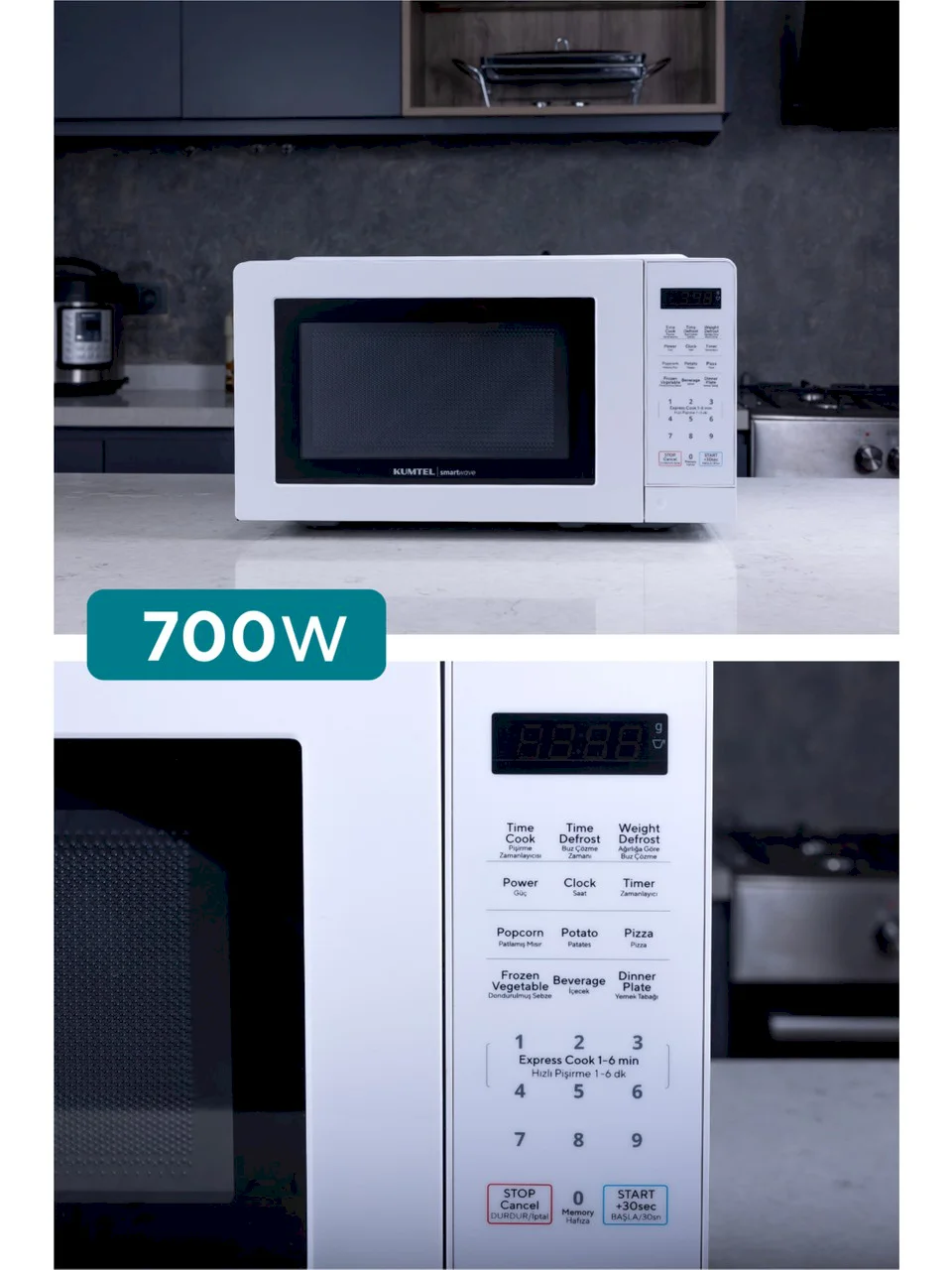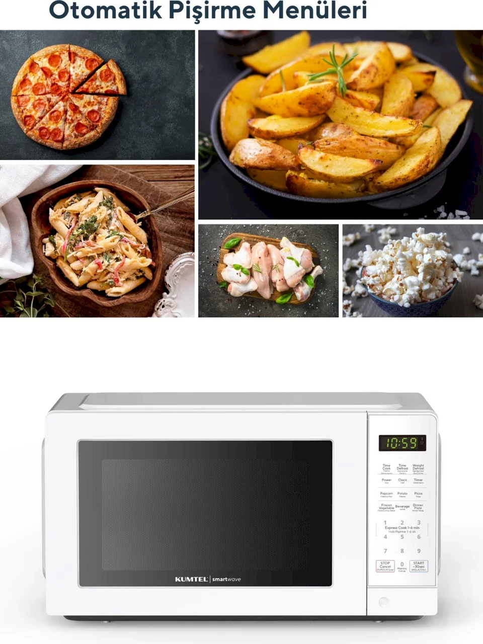 Kumtel Smartwave Dijital Inverter Mikrodalga700 Watt Güç Çıkışı20 L KapasiteOtomatik Pişirme Programları: Buz çözme, Ağırlığa göre buz çözme, Patlamı mısır, Patates, Pizza, İçecek dondurulmuş sebze, Yemek tabağıDijital ZamanlayıcıPush Button ÖzelliğiKolay Buz Çözme FonksiyonuAyarlanabilir Pişirme ZamanlayıcısıÇocuk KilidiÜrün Boyutu: 422*329*237.5 mm24 Ay Kumtel Garantili.