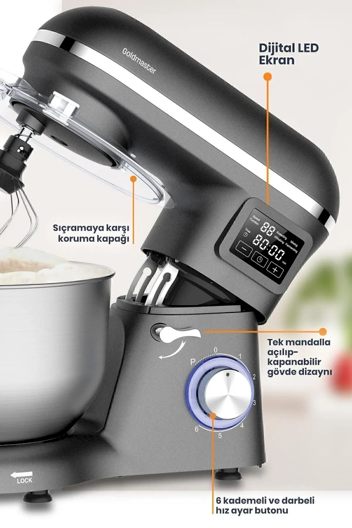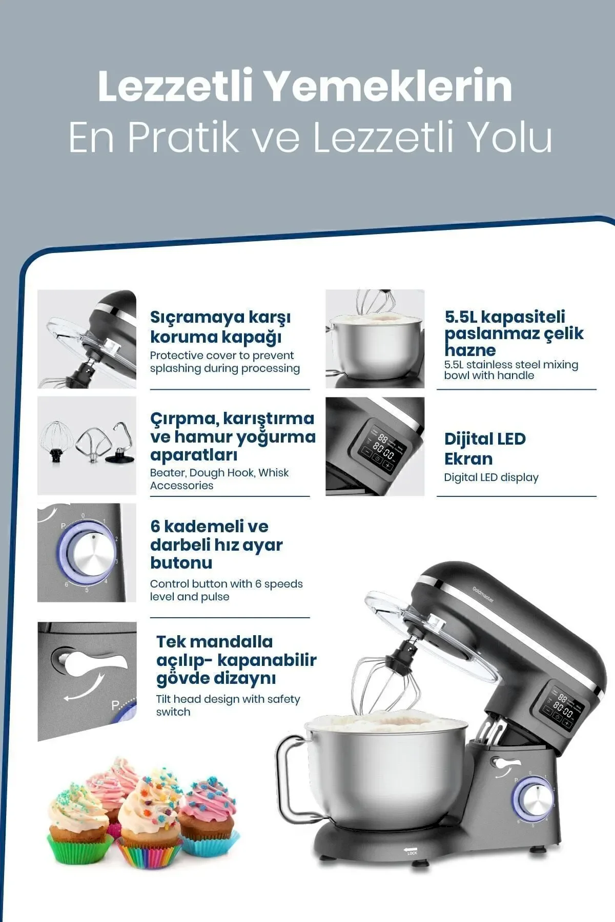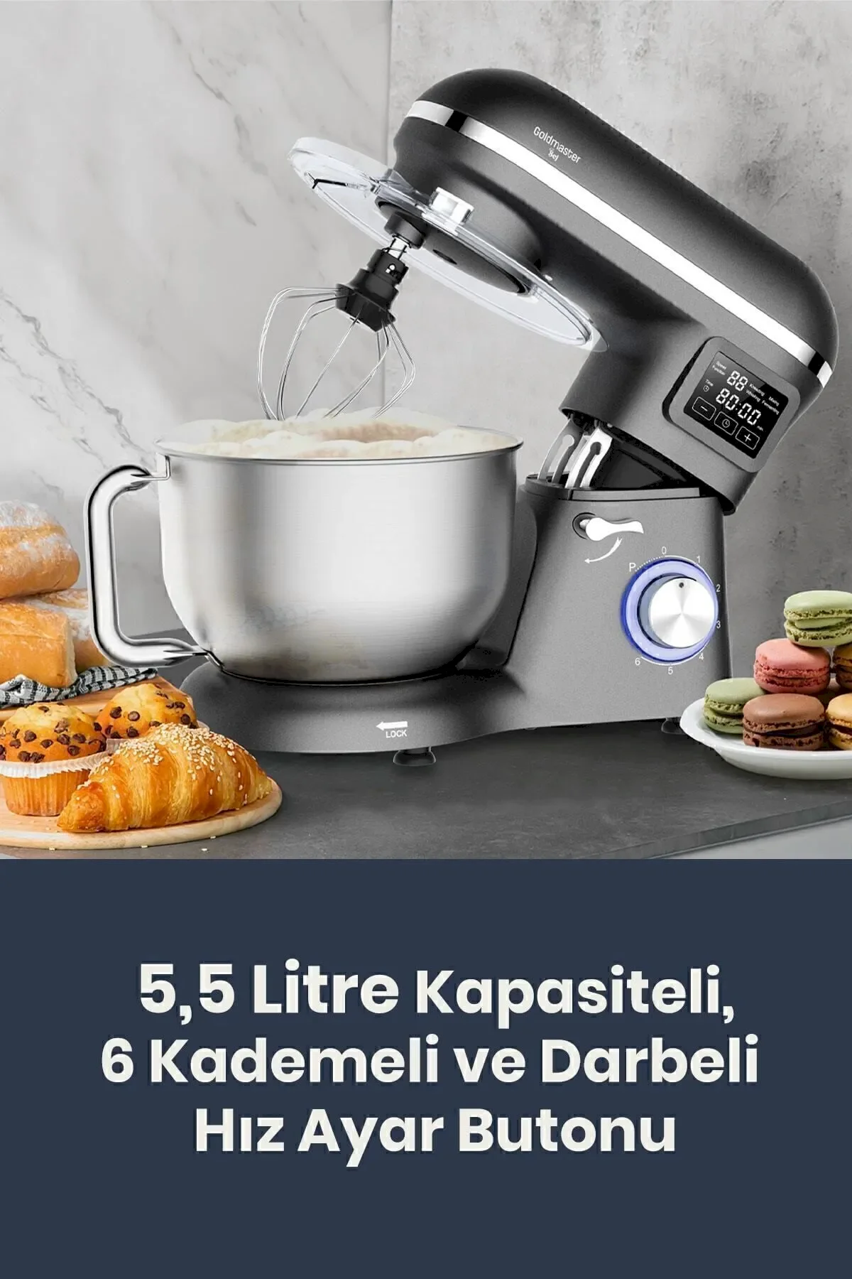 LED Göstergeli : varHazne Kapağı : varHamur Kancası : varÇırpma : varKarıştırma : varHazne : 5.5 ltGüç : 1500 WKademe Sayısı : 6Hazne Malzemesi : Paslanmaz Çelik